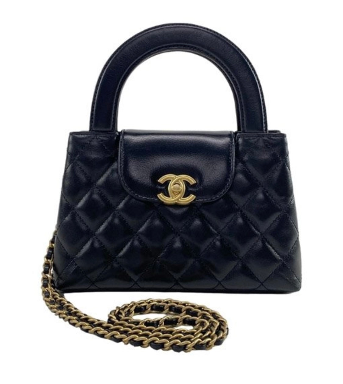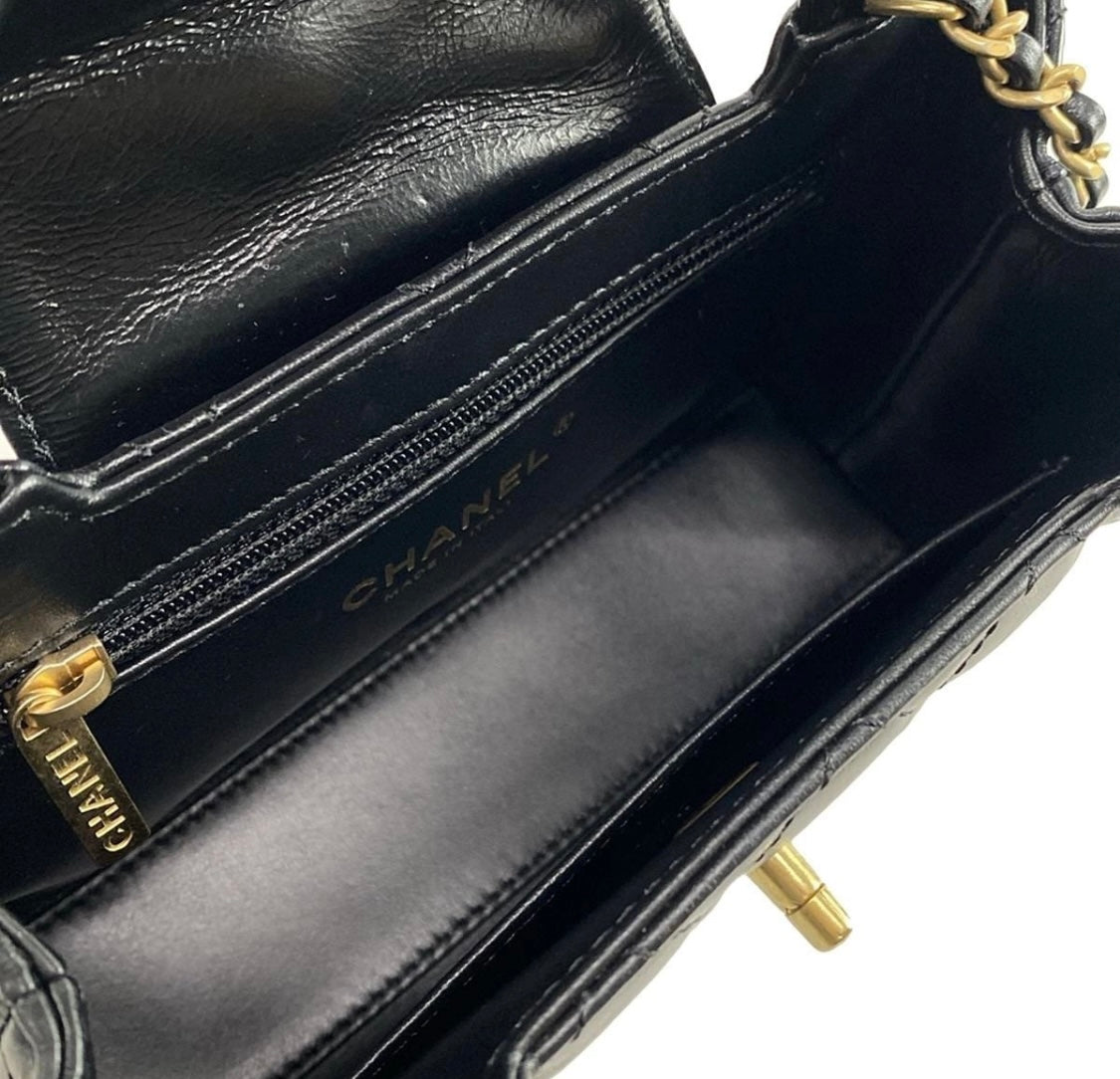 Indulge in luxury with the Chanel Mini Shopping Bag. Crafted from shiny aged calfskin and adorned with golden hardware, this black bag exudes elegance.