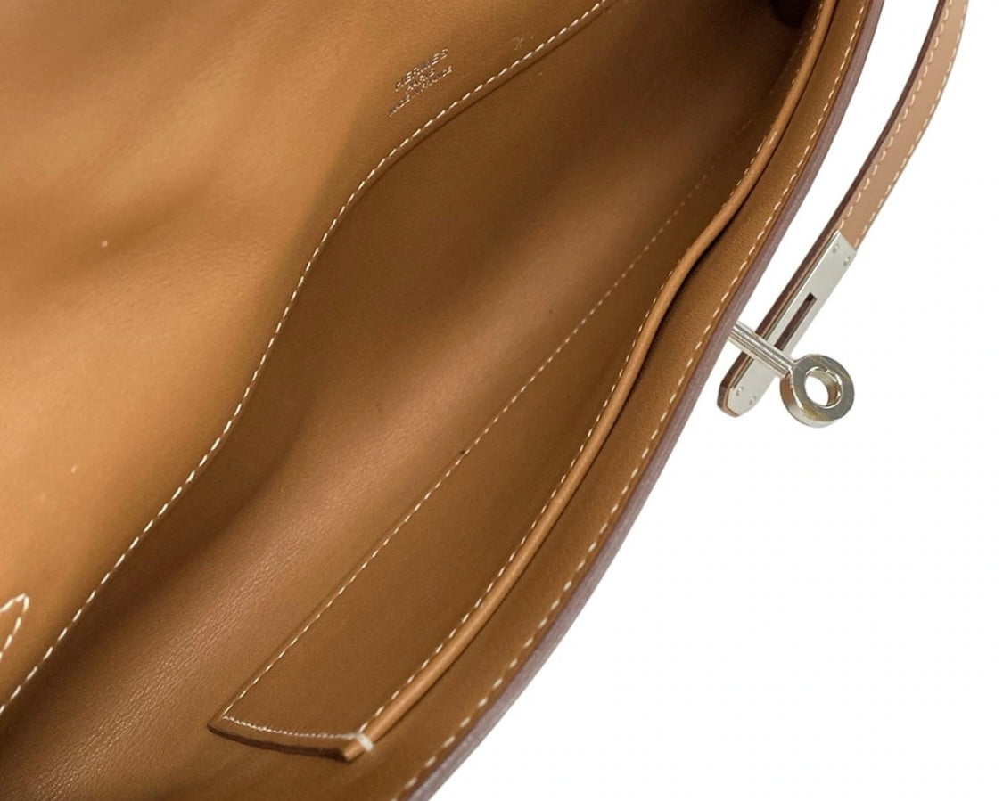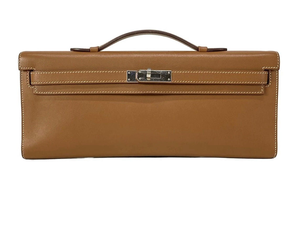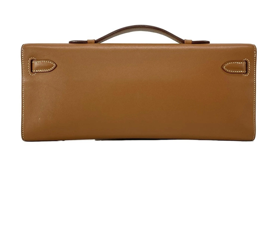 This Hermès Kelly Cut Clutch in Gold Veau Swift leather combines timeless elegance with refined craftsmanship. Featuring sleek palladium hardware, its supple veau Swift leather offers a smooth, luxurious texture. Measuring 31 cm by 13 cm, this pre-owned piece is perfect for sophisticated occasions, providing ample space while maintaining a slim, graceful silhouette. A true statement of understated luxury for discerning collectors.