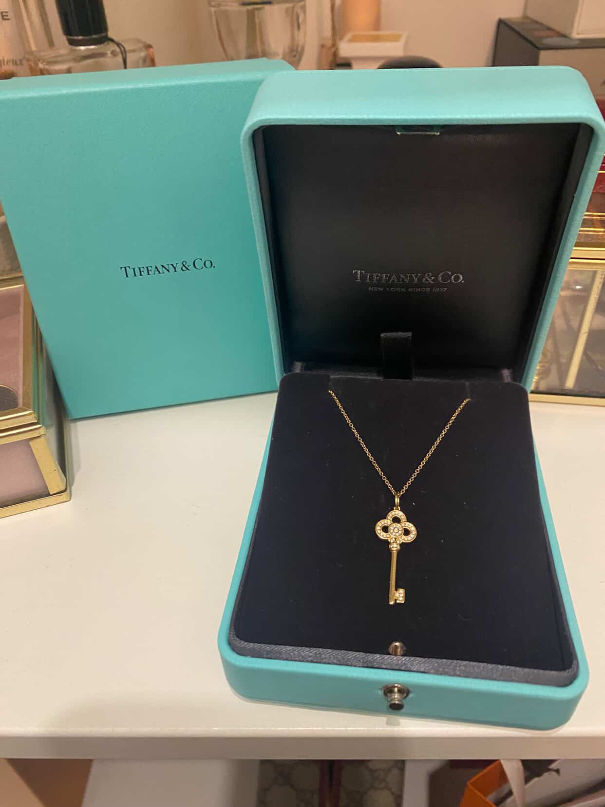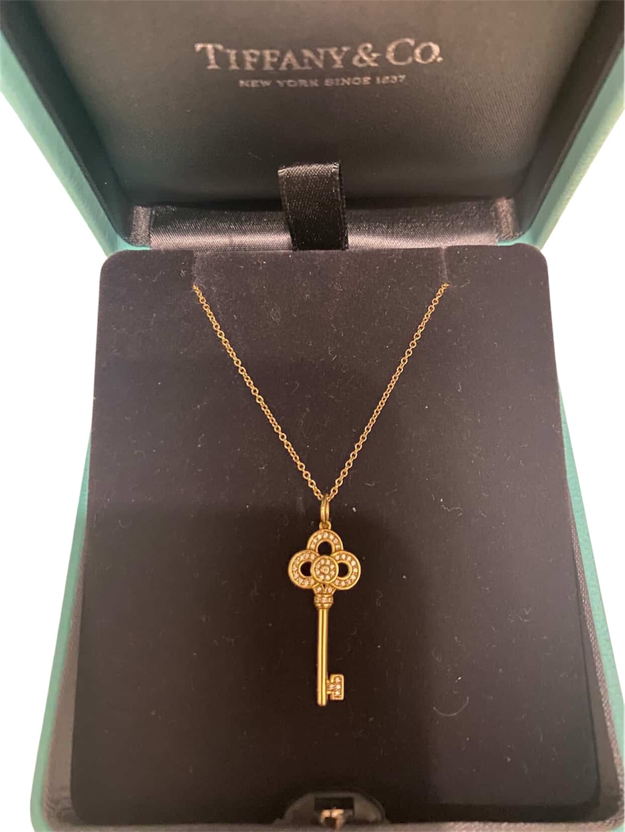 Crafted in 18K yellow gold, the pendant features Tiffany’s signature ornate key design, delicately set with brilliant-cut diamonds that add radiant sparkle to every movement. The intricate clover-inspired head and fine detailing reflect the Maison’s heritage of exceptional artistry.